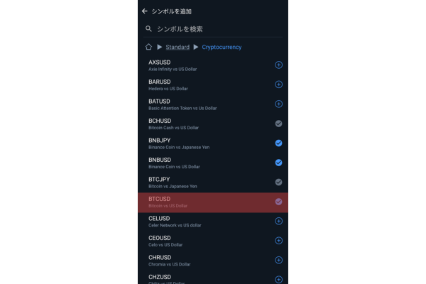 Crypto currencyをタップすると、取引できる暗号資産の銘柄が一覧で表示されます。