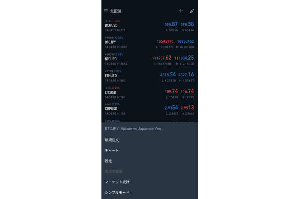 ここで、BTCを含む銘柄をタップすると、気配値画面に追加されます。