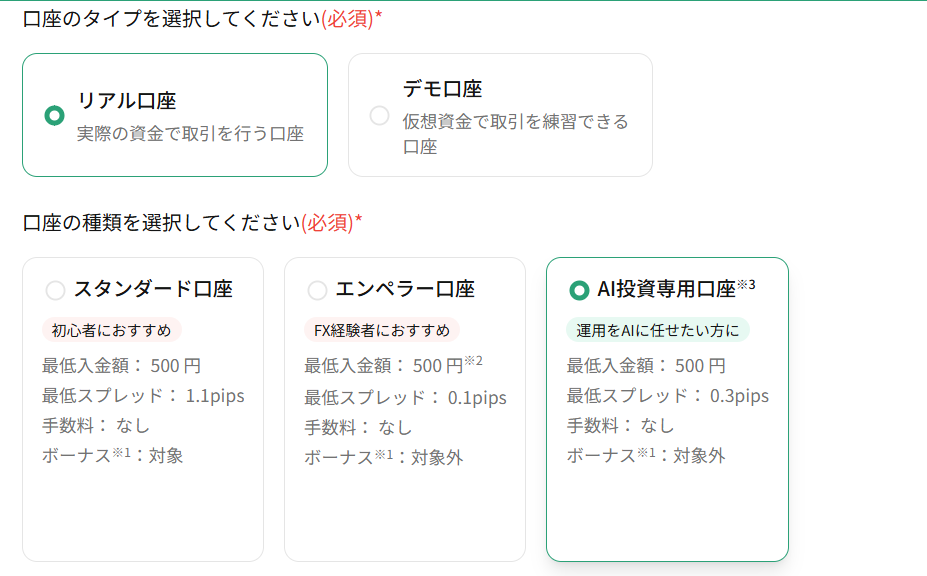 AIおまかせトレーダーは、新規口座開設画面から、AI投資専用口座を選択して口座を開設します。