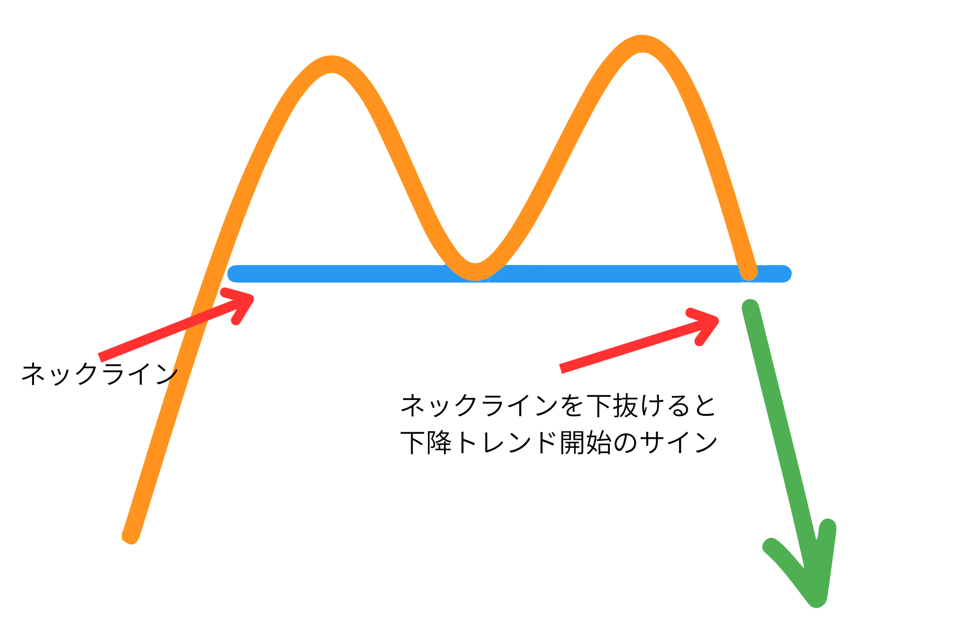 その後、ネックラインを下抜けるとトレンド転換の可能性が高まります。