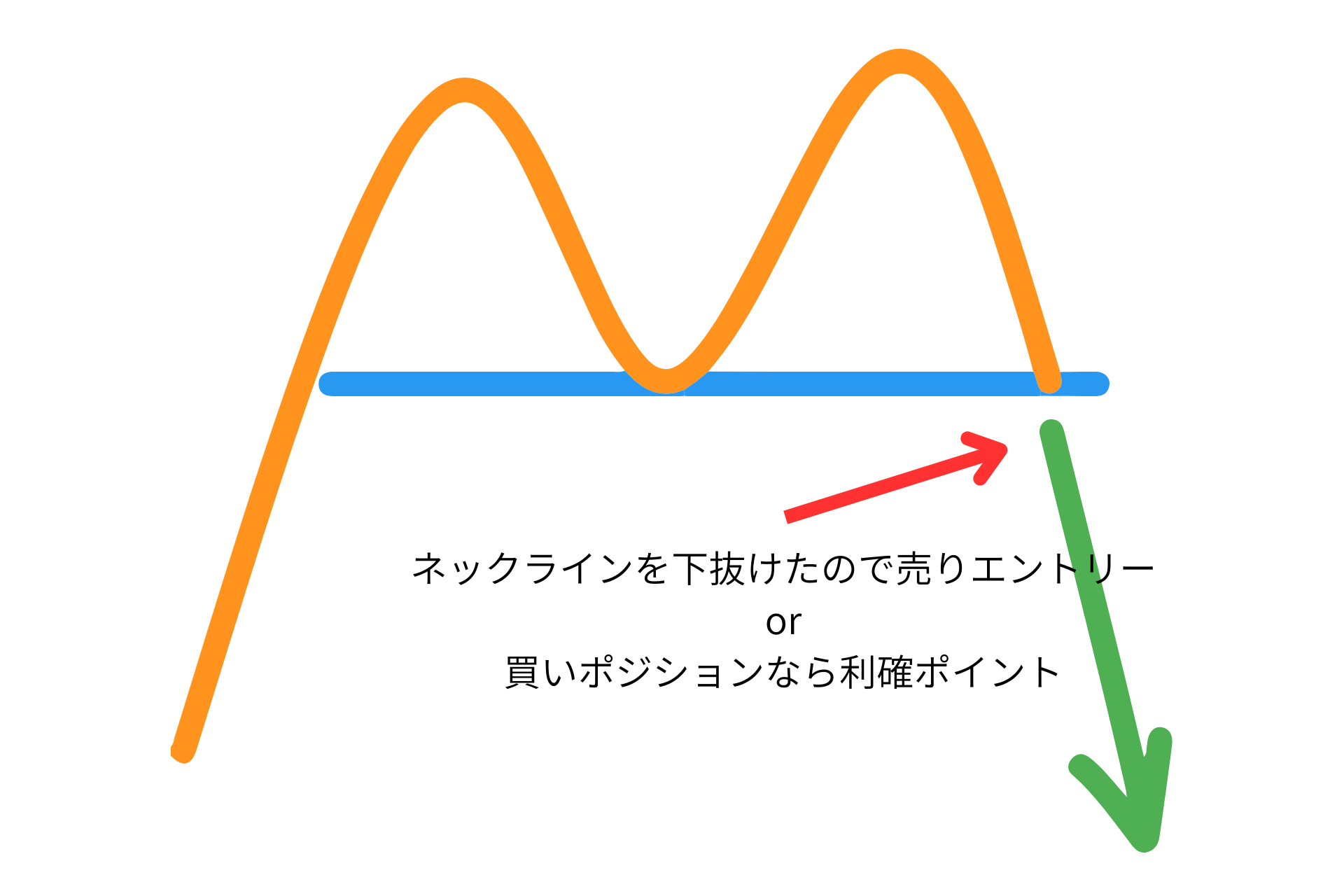 基本はネックラインを下抜けたら売り。買いポジションを持っていたなら利確ポイントの目安にするのがセオリーです。