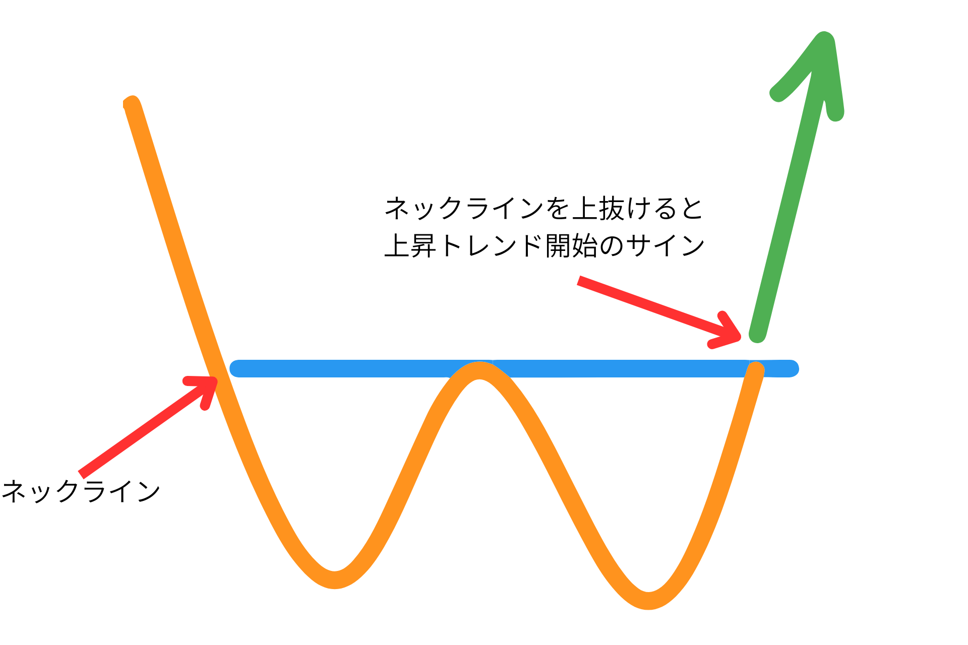ダブルボトムは、下降トレンドの終わりに出現する底打ちパターンです。